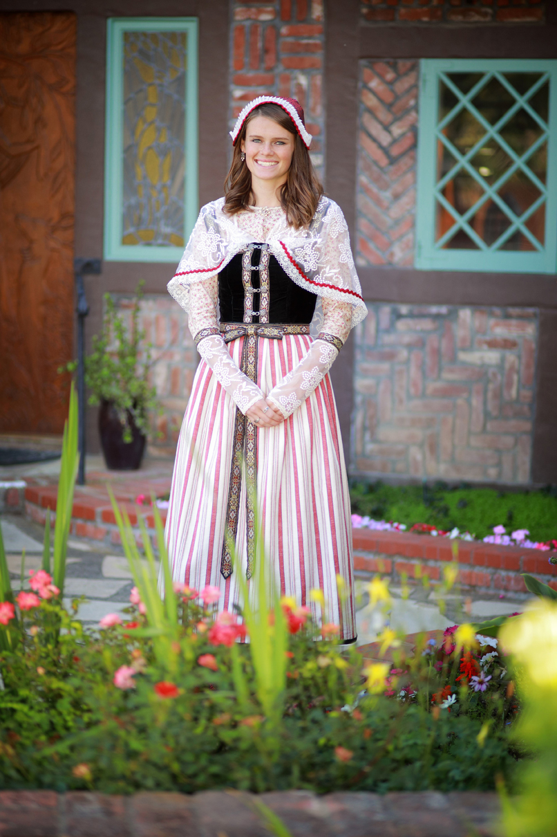 Gabrielle explained, “I fell in love with my mother’s Danish Days costume which was fashioned after a Danish wedding dress circa 1750-1900s, which I’ve been lucky enough to borrow for the past three years. So in designing my dress this year, I based it off of the same style as hers, copying the lovely lace sleeves and delicate trim and bodice. I chose the traditional Danish black and red for the colors of my costume. It’s very sweet to be Danish Maid and to pay homage to my mother’s costume, to truly follow in her footsteps as Maid. I believe she might be more excited than I am!”
